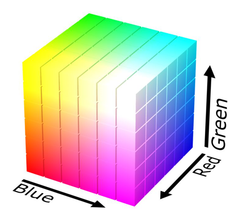 我們可以用一個(gè)立方體來表示RGB色彩模型,因?yàn)槲覀儎偛耪f了任意一種色彩都可以被拆分為R、G、B三個(gè)分量,同理,立方體中的任意一個(gè)點(diǎn)的位置坐標(biāo)也可以拆分為X、Y、Z三個(gè)分量,因此我們就可以利用立方體里面的某個(gè)點(diǎn)來表示某種顏色。