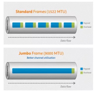 它們承載比普通以太網(wǎng)幀大得多的有效載荷。巨型幀最多可以加載9000字節(jié),而不是通常的最大1500字節(jié)。巨型幀可以承載六倍于標準幀的數(shù)據(jù)量,理論上在理想條件下,可以將網(wǎng)絡(luò)上傳輸?shù)臄?shù)據(jù)包數(shù)量減少到標準速率的六分之一。